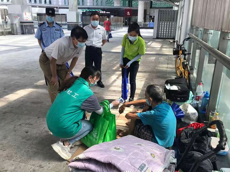 今年6月19日是第九个全国救助管理机构“开放日”,广州市救助管理机构因疫情防控工作需要,实施封闭式管理,不对公众实地开放,普遍采取“线上开放”和“走出去”的方式,通过云上参观、录制视频、播放公益广告等形式宣传救助管理工作,展示受助人员“临时家园”的温暖场景,传递“携手相助,让爱团聚”的救助正能量。在车站、广场、社区依托救助咨询点、爱心驿站、公益宣传栏,宣传救助管理政策、宣讲防疫知识、派发救助管理手册、派送救助礼包(含救助指引卡、口罩、免洗手消毒液、食品、防中暑药品等),呼吁引导社会公众关心救助管理工作、关爱流浪乞讨人员、齐心协力战胜疫情。13支街面救助管理小分队既是“流动宣传阵地”,又是“防疫突击队”,在深入街头巷尾张贴海报、发动社区群众参与救助服务工作的同时,及时发现、引导、护送流浪乞讨人员进站接受救助,为不愿进站求助的流浪乞讨人员测量体温、派发口罩和爱心礼包、安排核酸检测,并与社区联动督促其落实防疫措施,配合健康管理。
