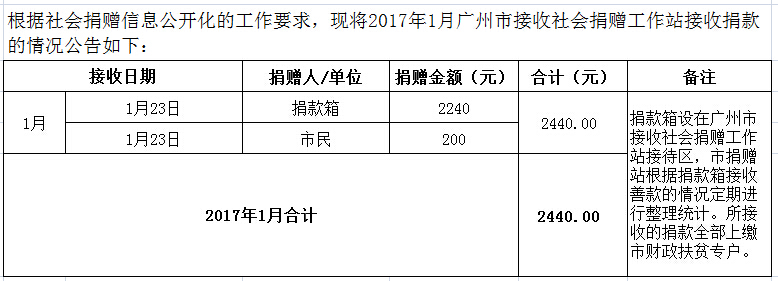 广州市接收社会捐赠工作站关于接收捐款情况的公告(2017年1月)